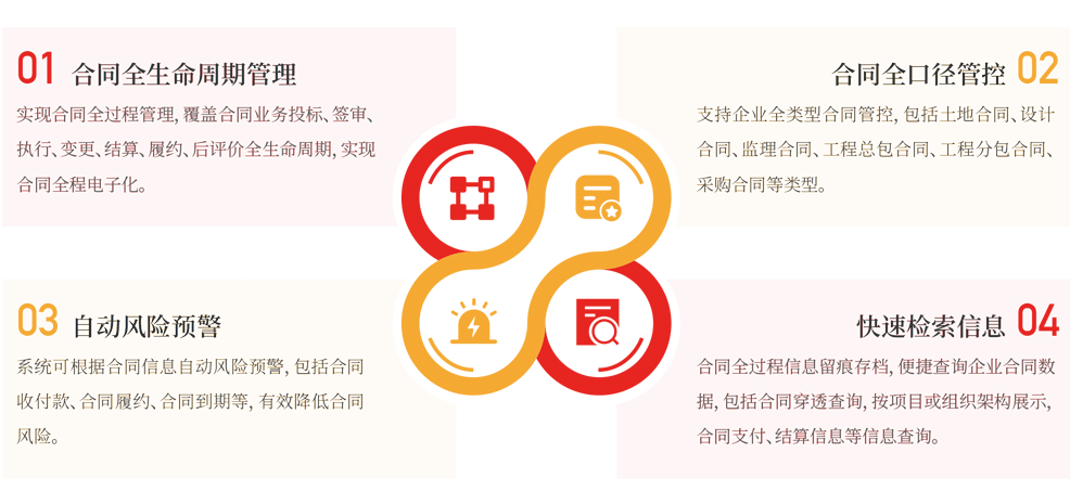 合同管理(lǐ)系統是創力科技(jì)專為(wèi)國有(yǒu)企業打造的合同業務信息化管理(lǐ)平台,實現招投标、簽審、執行(xíng)、變更、結算(suàn)、履約、後評價的全生(shēng)命周期管理(lǐ),全程電(diàn)子化管控,規範業務流程,實時(shí)掌控信息,完成企業合同事務的監控分析、跟蹤管理(lǐ)和(hé)風險預警。同時(shí),可(kě)與人(rén)力資源、财務等系統集成互通(tōng),貫通(tōng)業務财務數(shù)據,核對企業資金計(jì)劃,形成合同分析報表,實時(shí)反映企業業務現狀,實現業财一體(tǐ)化。滿足企業合同管控需求,廣泛适用于多(duō)業态國企,覆蓋投資平台、工程建設、市政建設、房(fáng)地産建設、環保水(shuǐ)務、交通(tōng)能源、資産運營管理(lǐ)、醫(yī)療健康、休閑旅遊等行(xíng)業。