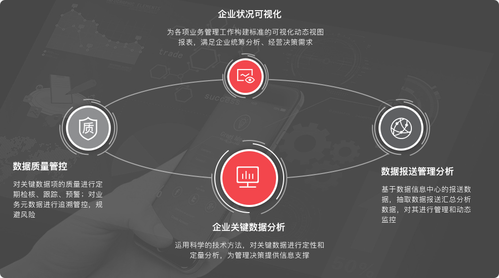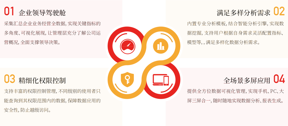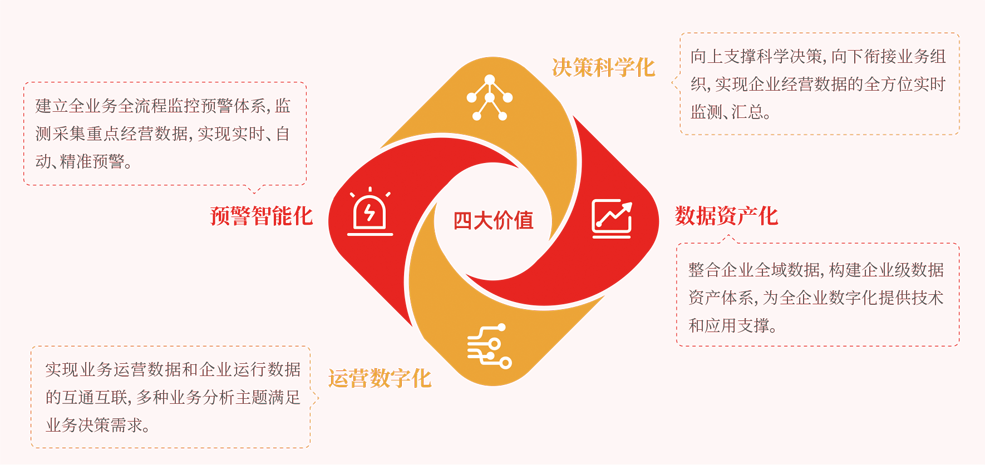 經營決策分析平台滿足管理(lǐ)層數(shù)據統籌分析需求,運用科學技(jì)術(shù)方法,對專項業務統計(jì)數(shù)據進行(xíng)定量和(hé)定性分析,分類聚合企業經營決策關鍵數(shù)據,通(tōng)過統一的信息窗口形成可(kě)視(shì)化動态數(shù)據分析圖表,綜合展示企業經營狀況;完成內(nèi)部信息與資源整合,實現經營業務數(shù)據穿透查詢與組合分析,為(wèi)經營管理(lǐ)決策提供充分的綜合性信息支撐。滿足大(dà)型集團化企業管控需求,适用于多(duō)業态國企,覆蓋投資平台、工程建設、市政建設、房(fáng)地産建設、環保水(shuǐ)務、交通(tōng)能源、資産運營管理(lǐ)、醫(yī)療健康、休閑旅遊等行(xíng)業。